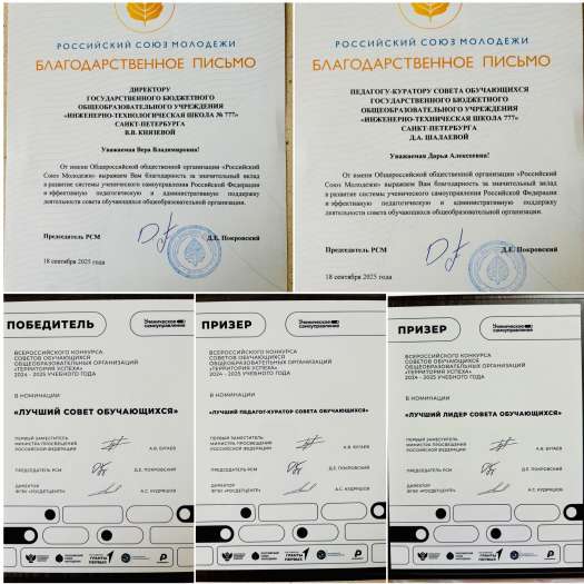 Команда ИТШ № 777 в составе Екатерины Смелковой, Кристины Забурдаевой, Егора Мельникова и Арсения Кирющенко под руководством педагога-куратора Дарьи Алексеевны Шалаевой блестяще справилась со всеми испытаниями, достойно представила опыт школы и была признана Лучшим советом обучающихся России.