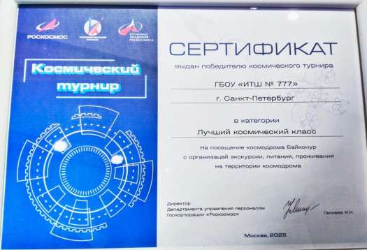 В номинации «Лучший космический класс» победу одержала команда Инженерно-технологической школы № 777 Санкт-Петербурга — класс 9.2. Педагог ИТШ № 777 Роман Евгеньевич Унгаров стал победителем в номинации «Лучший наставник космического класса».