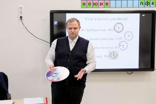 Урок английского языка «Который час? Время дробей» в классе 5.5 провёл Орлов Вадим Андреевич. Пятиклассники научились говорить о времени, используя выражения с дробями, такие как quarter past, half past, quarter to. Ученики закрепили навыки определения и озвучивания времени на английском языке, овладели специальной лексикой, связанной с делением часа на части. Связь этого урока с предметами «математика» и «русский язык» способствует формированию целостного понимания времени как математической и языковой категории, а также развитию навыков межпредметного и межкультурного общения.