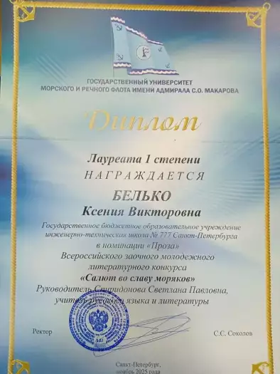 Обучающаяся 8.3 судостроительного класса Инженерно-технологической школы № 777 Санкт-Петербурга Белько Ксения стала лауреатом I степени.