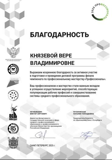 От имени директора Департамента государственной политики в сфере среднего профессионального образования и профессионального обучения Министерства просвещения Российской Федерации Виктора Сергеевича Неумывакина и председателя Комитета по образованию Санкт-Петербурга Наталии Геннадьевны Путиловской коллективу ИТШ № 777 Санкт-Петербурга в лице директора Инженерно-технологической школы № 777 Веры Владимировны Князевой была вручена благодарность за активное участие в подготовке и проведении Деловой программы Финала всероссийского чемпионата по профессиональному мастерству «Профессионалы».