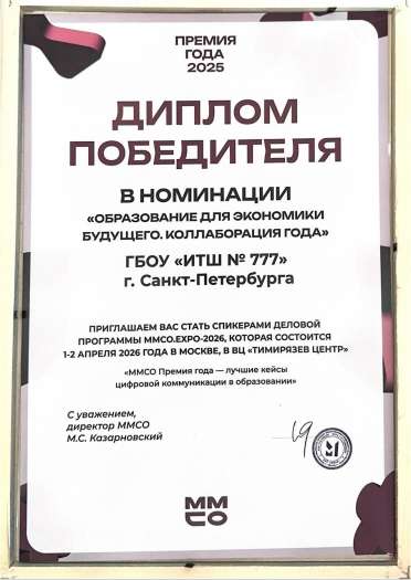 Консорциум по развитию школьного инженерно-технологического образования, учредителем которого является Инженерно-технологическая школа № 777 Санкт-Петербурга, занял почётное первое место в номинации «Коллаборация года». В представленной на Премию заявке подробно отражена система сотрудничества, коллаборация организаций, совместно формирующих качественные инженерные кадры для предприятий высокотехнологичных отраслей промышленности.