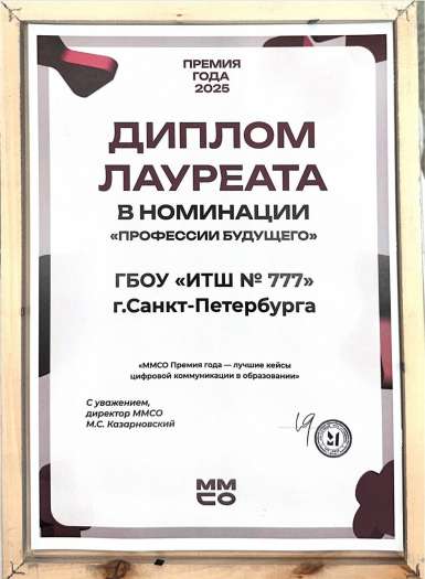 Инженерно-технологическая школа № 777 стала лауреатом в номинации «Профессии будущего» ежегодной Премии Московского международного салона образования. На номинирование была представлена практика формирования инженерных кадров, реализуемая Центром "ПрофВыбор", Центром выявления и развития талантов "Эврика", педагогическим сообществом Инженерно-технологической школы № 777 под руководством Веры Владимировны Князевой, директора ИТШ № 777.