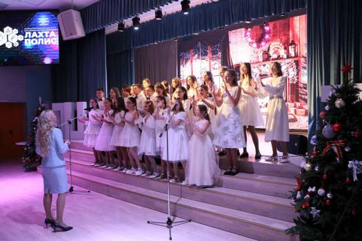 Обучающиеся Инженерно-технологической школы № 777 и ЦДОД «Лахта-полис» погрузили зрителей в сказочную атмосферу музыки, исполнив новогодние композиции.
