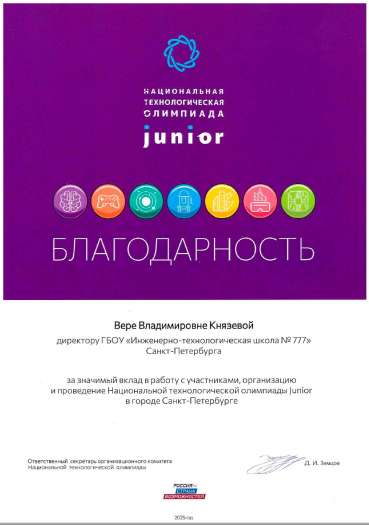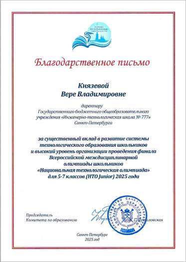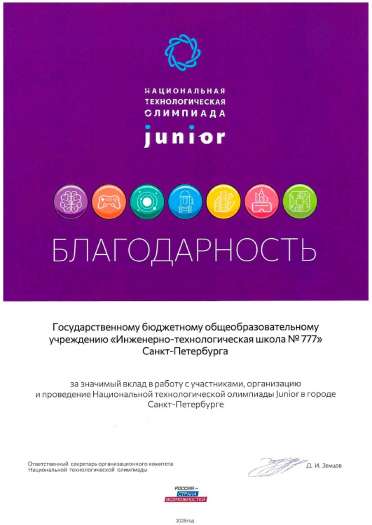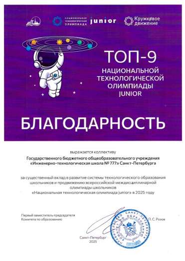 Коллектив Инженерно-технологической школы № 777 также удостоен благодарности организационного комитета Национальной технологической олимпиады за качественное проведение финала НТО и подготовку победителей и призёров.