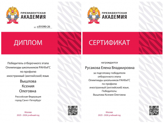 Поздравляем Ксению и учителя английского языка Русакову Елену Владимировну с высоким результатом и желаем успехов на заключительном этапе олимпиады!