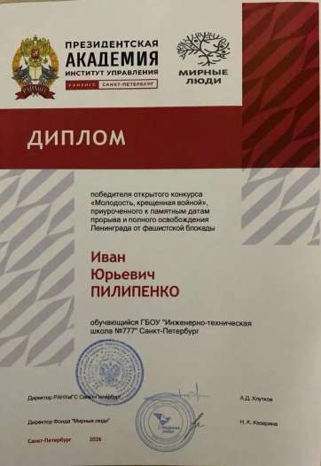 Иван не просто успешно справился с предложенным заданием, но и проявил глубокий интерес к истории родного города, уважение к памяти героев войны. За победу Иван получил сертификат на путешествие по местам боевой славы Ленинградской области в 2026 году.